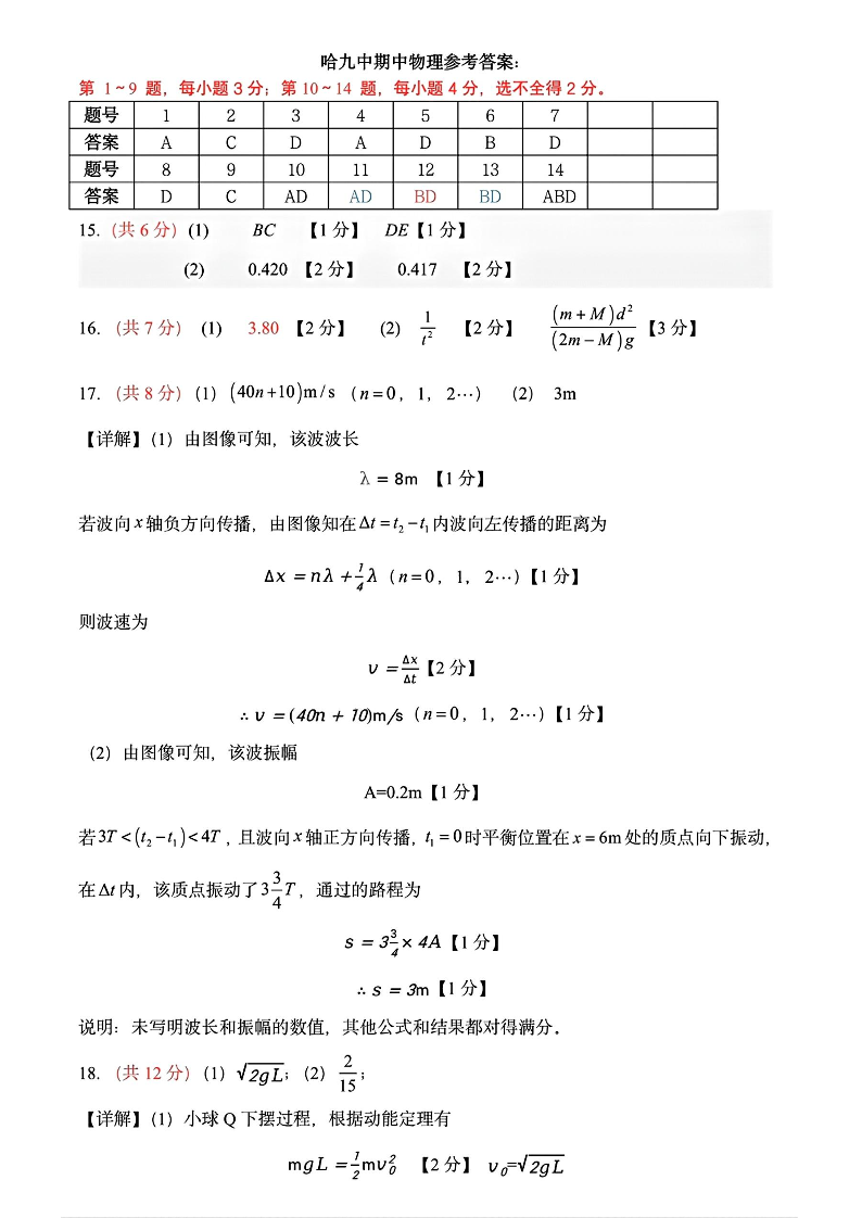 黑龙江省哈尔滨市第九中学2025届高三上学期期中考试物理答案