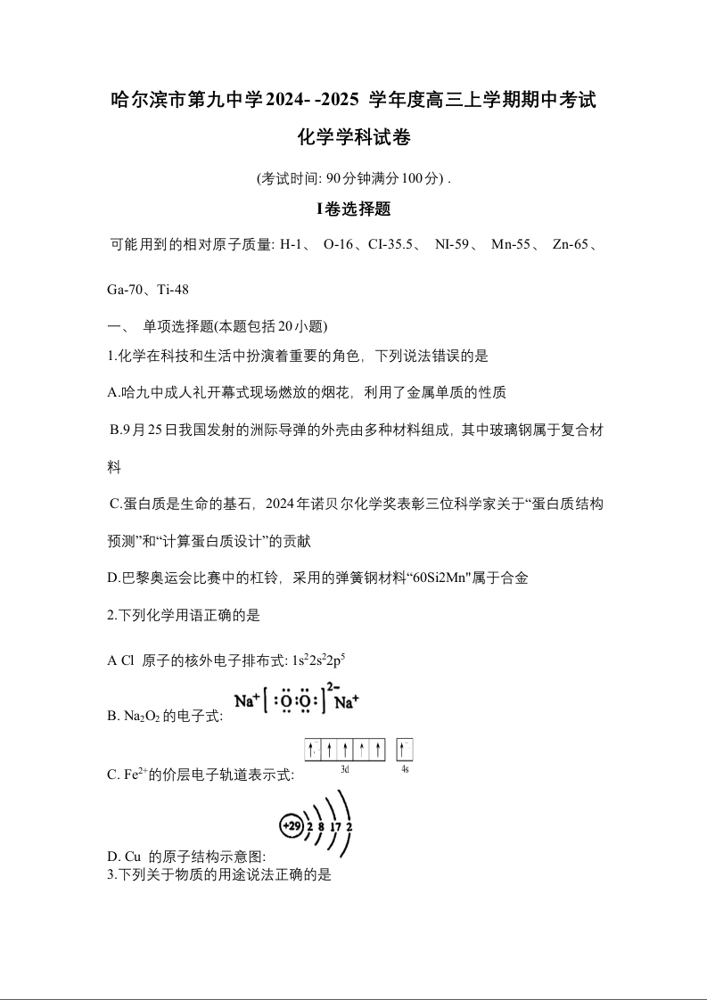 黑龙江省哈尔滨市第九中学2025届高三上学期期中考试化学+答案