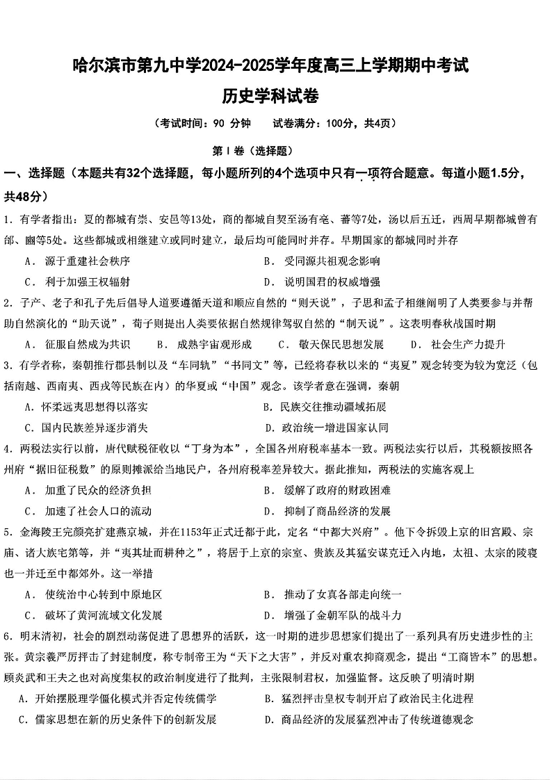 黑龙江省哈尔滨市第九中学2025届高三上学期期中考试历史+答案