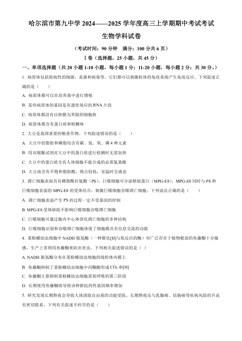 黑龙江省哈尔滨市第九中学2025届高三上学期期中考试生物+答案