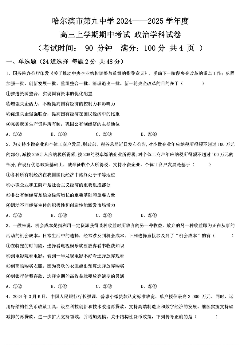 黑龙江省哈尔滨市第九中学2025届高三上学期期中考试政治+答案