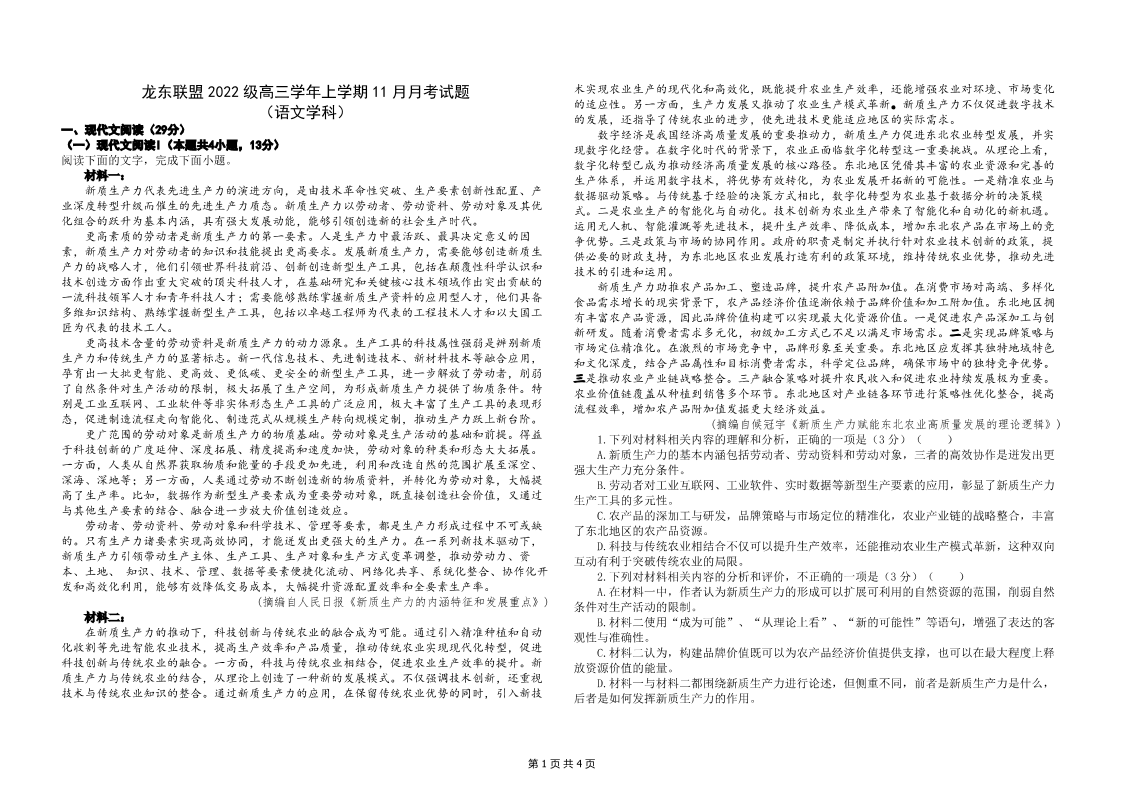 黑龙江省龙东联盟2025届高三上学期11月月考语文
