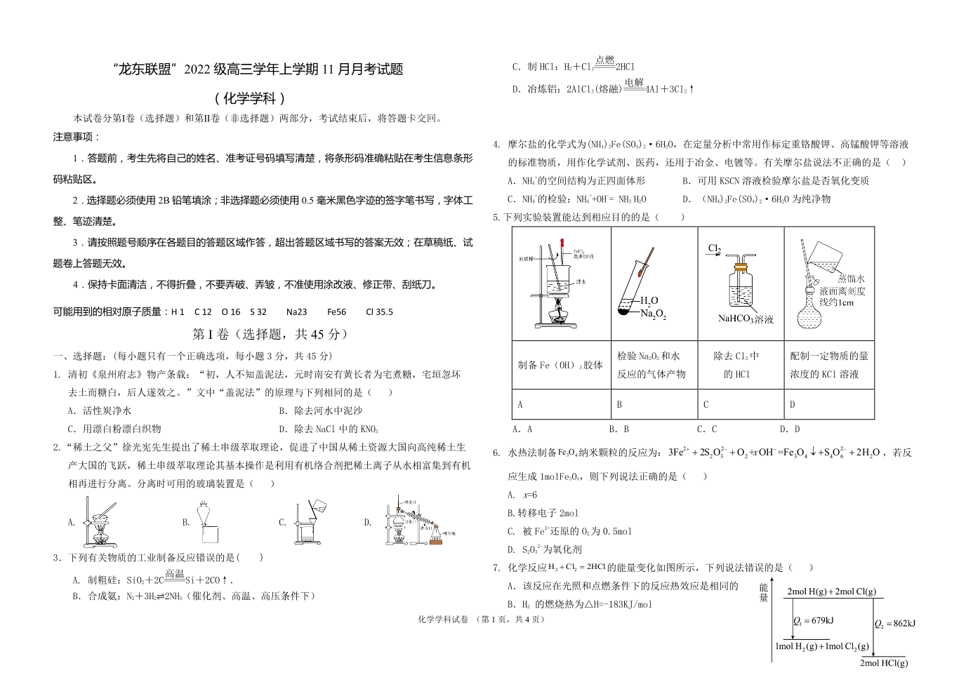 黑龙江省龙东联盟2025届高三上学期11月月考化学