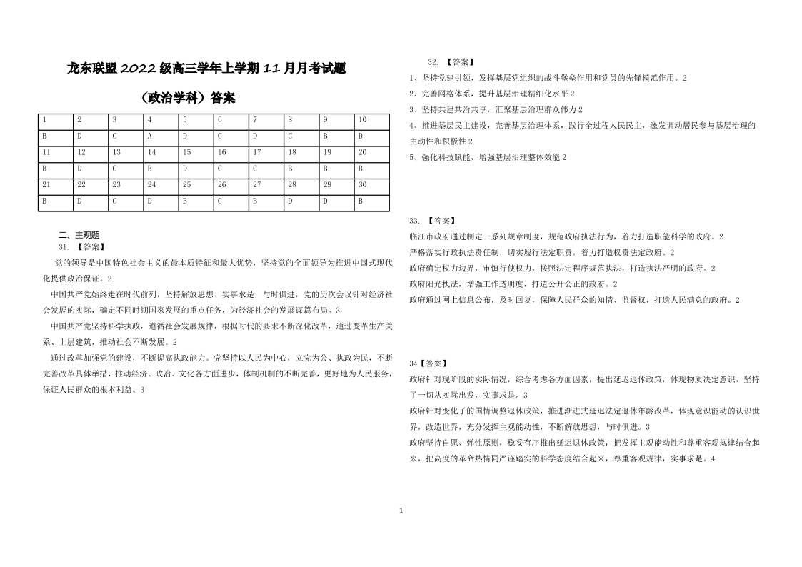 黑龙江省龙东联盟2025届高三上学期11月月考政治答案