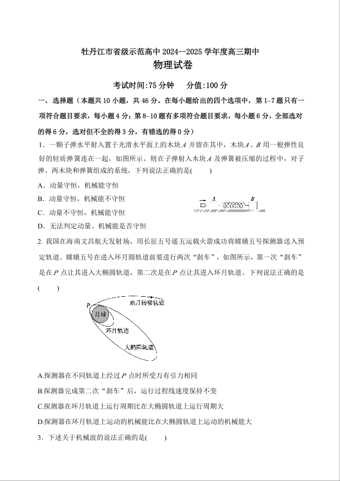黑龙江省牡丹江市省级示范高中2025届高三上学期期中考试物理+答案