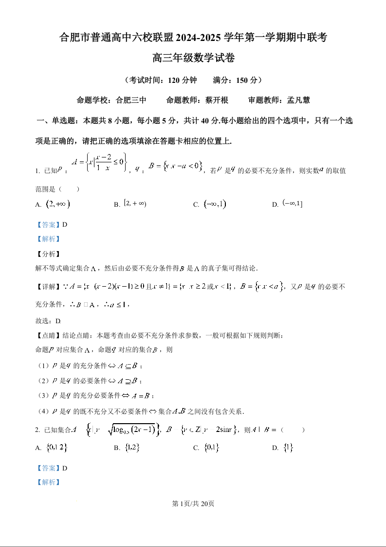 安徽省合肥市普通高中六校联盟2025届高三上学期11月期中联考数学(精品解析版)