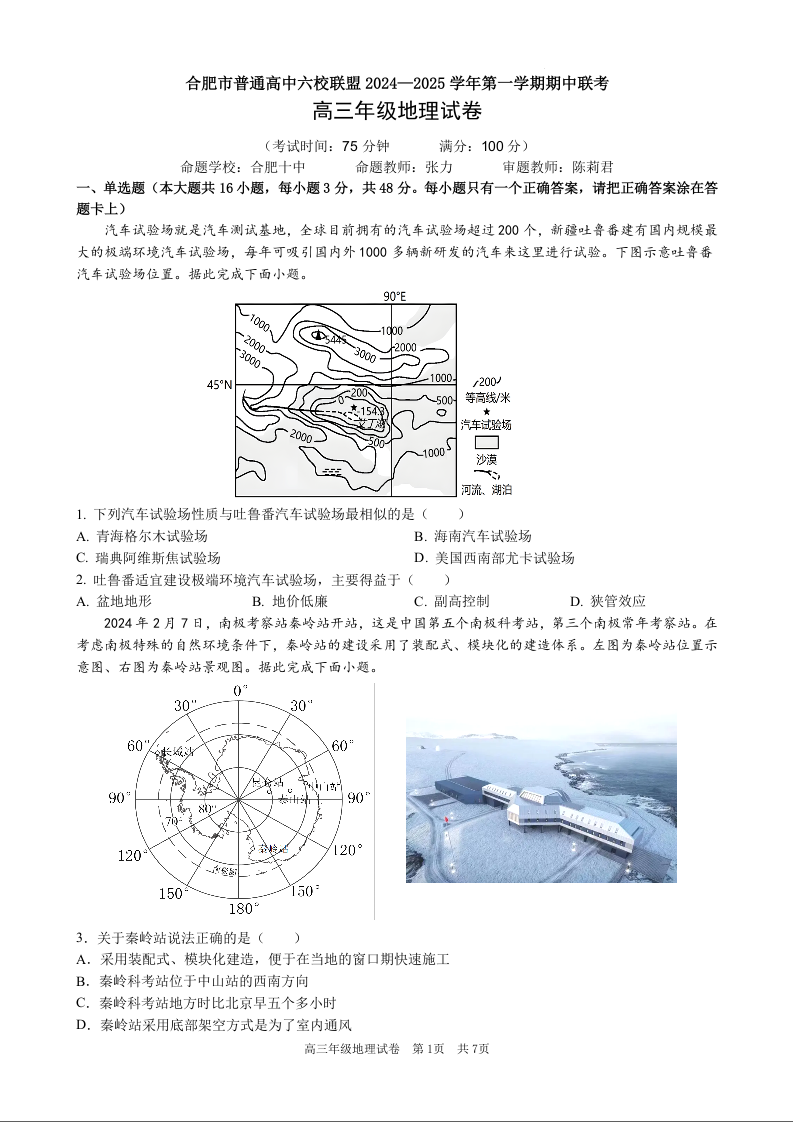 安徽省合肥市普通高中六校联盟2025届高三上学期11月期中联考地理