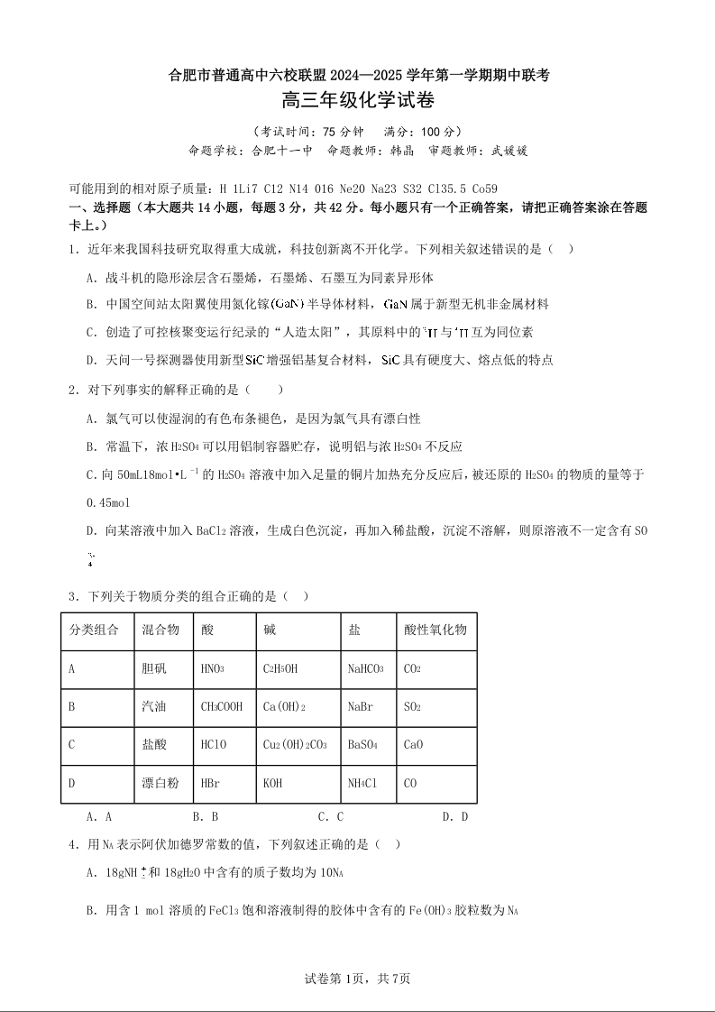 安徽省合肥市普通高中六校联盟2025届高三上学期11月期中联考化学