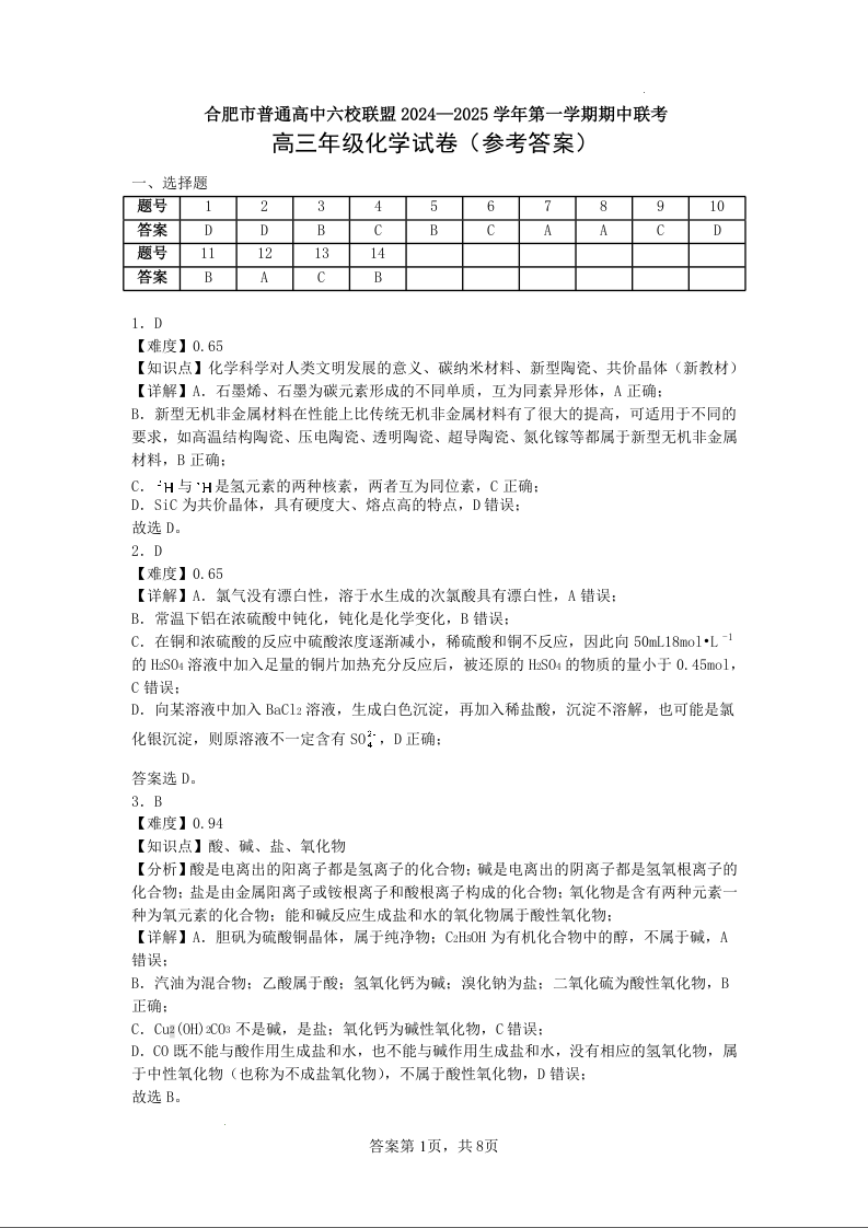 安徽省合肥市普通高中六校联盟2025届高三上学期11月期中联考化学答案