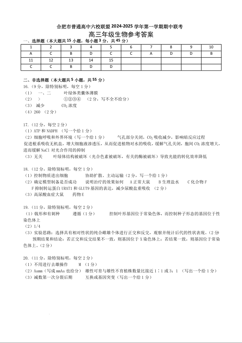 安徽省合肥市普通高中六校联盟2025届高三上学期11月期中联考生物答案