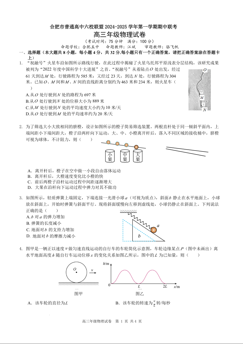 安徽省合肥市普通高中六校联盟2025届高三上学期11月期中联考物理