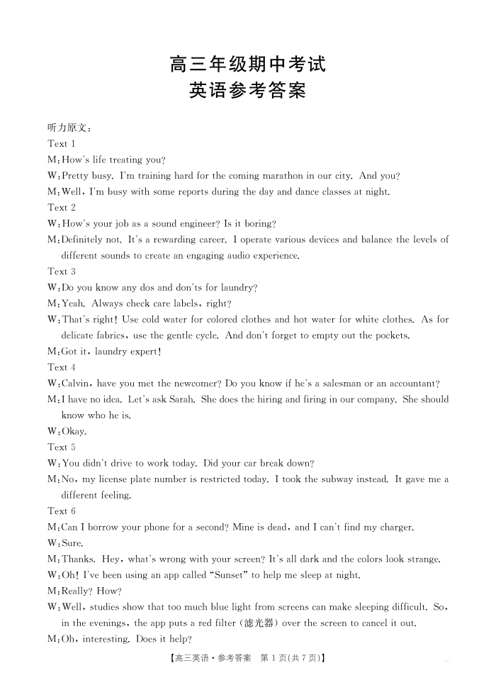 河北省部分学校2025届高三11月期中考试英语答案