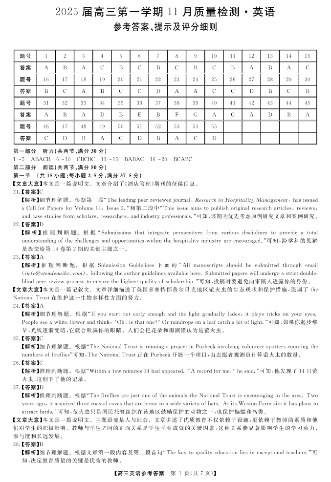 河南省部分示范性高中2025届高三上学期11月期中质量检测英语答案