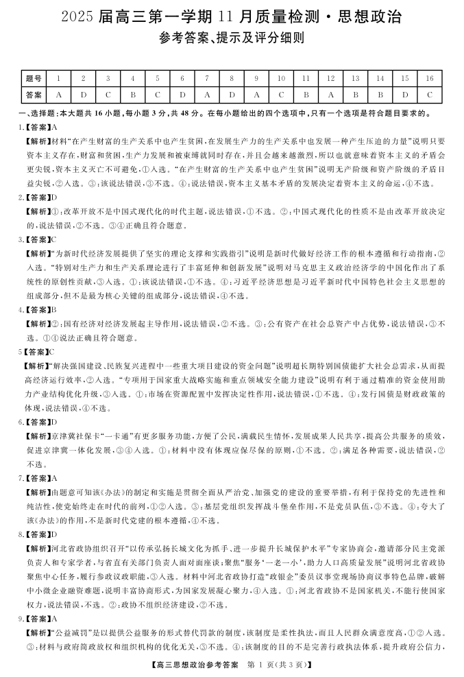 河南省部分示范性高中2025届高三上学期11月期中质量检测政治答案