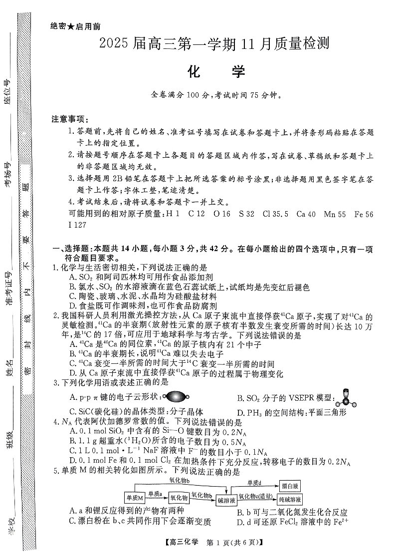 河南省部分示范性高中2025届高三上学期11月期中质量检测化学