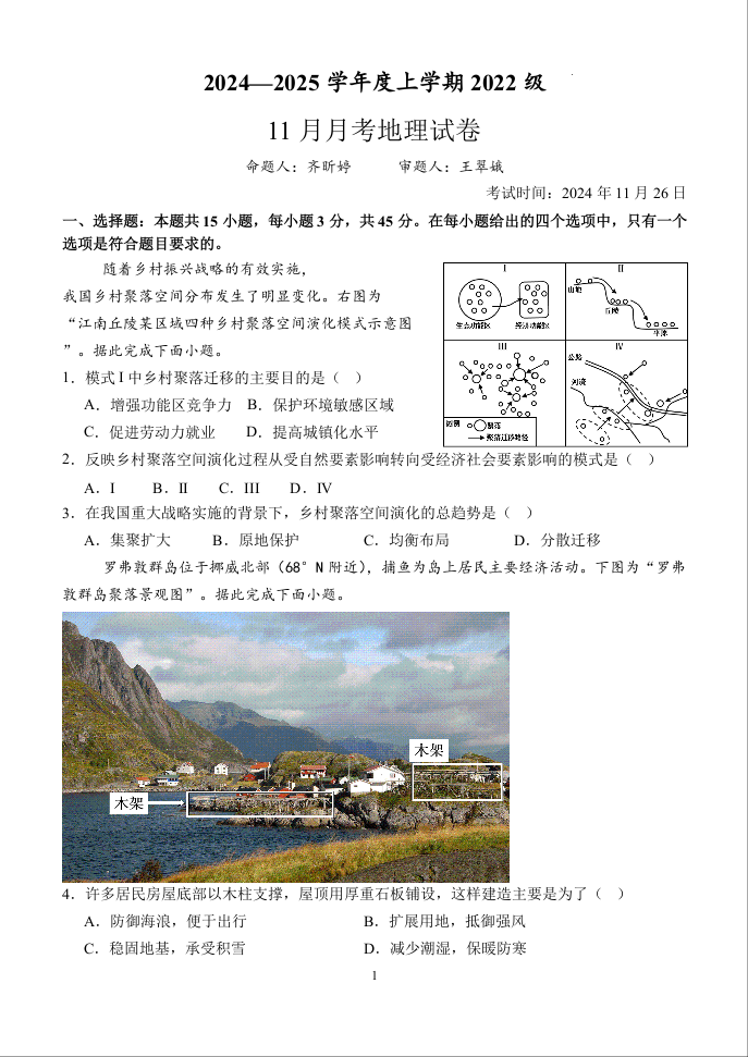 湖北省荆州沙市中学2025届高三上学期11月月考地理