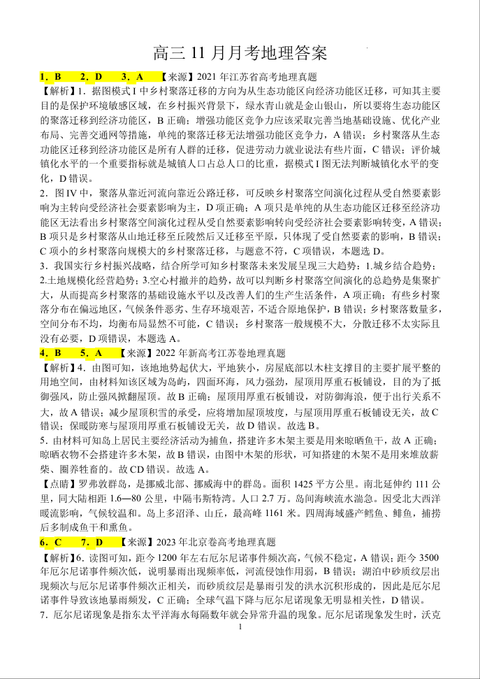 湖北省荆州沙市中学2025届高三上学期11月月考地理答案