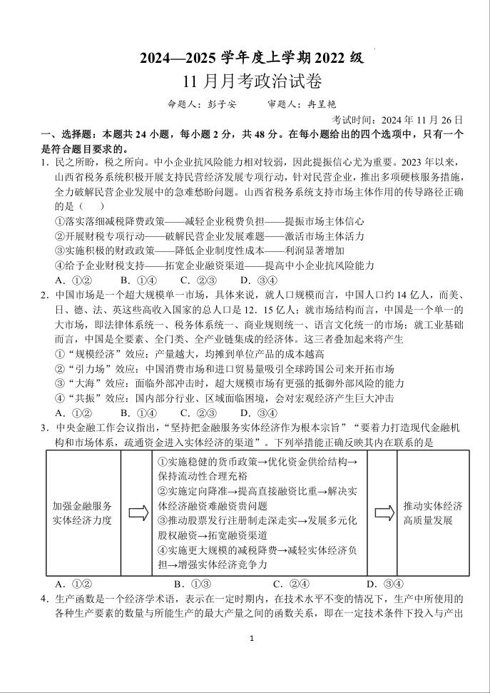 湖北省荆州沙市中学2025届高三上学期11月月考政治