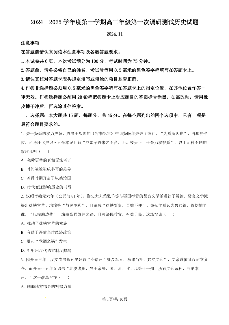 江苏省淮安市2025届高三上学期第一次调研测试历史+答案