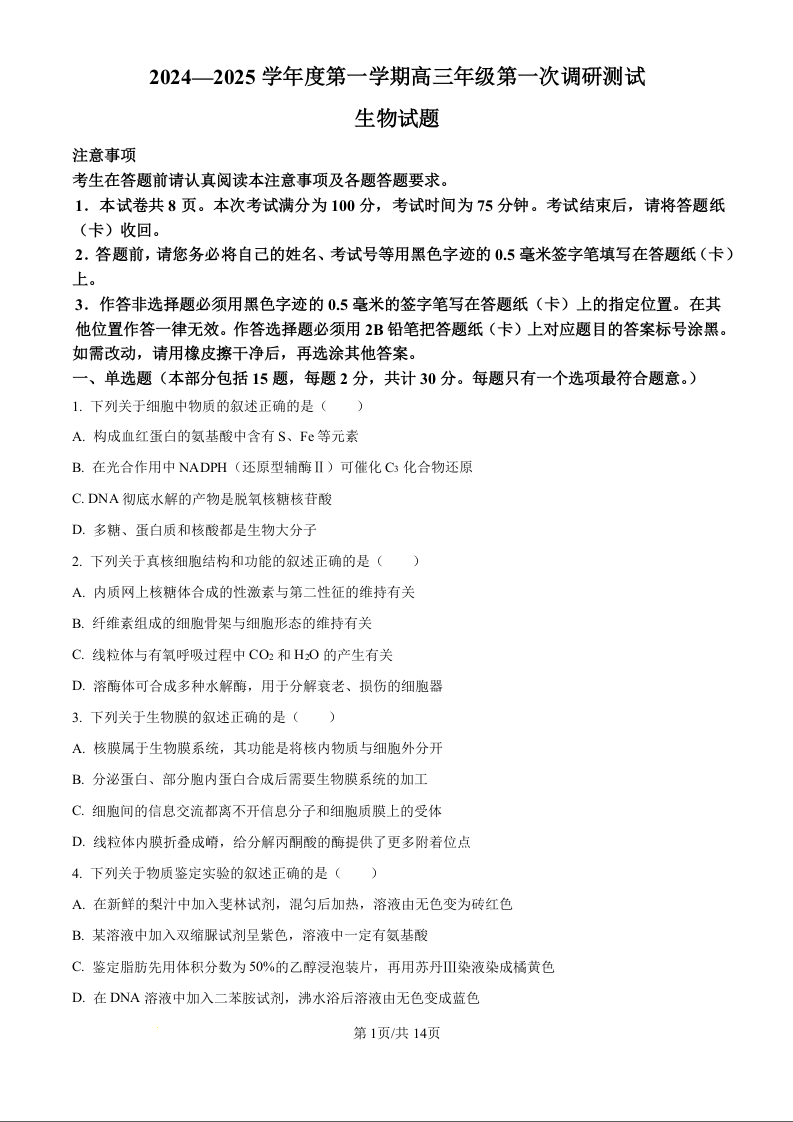 江苏省淮安市2025届高三上学期第一次调研测试生物+答案