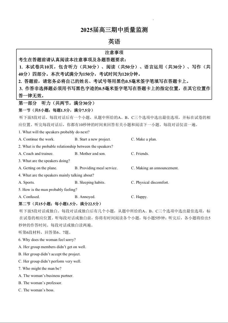 江苏省南通市通州区、如东县2025届高三上学期11月期中联考英语+答案