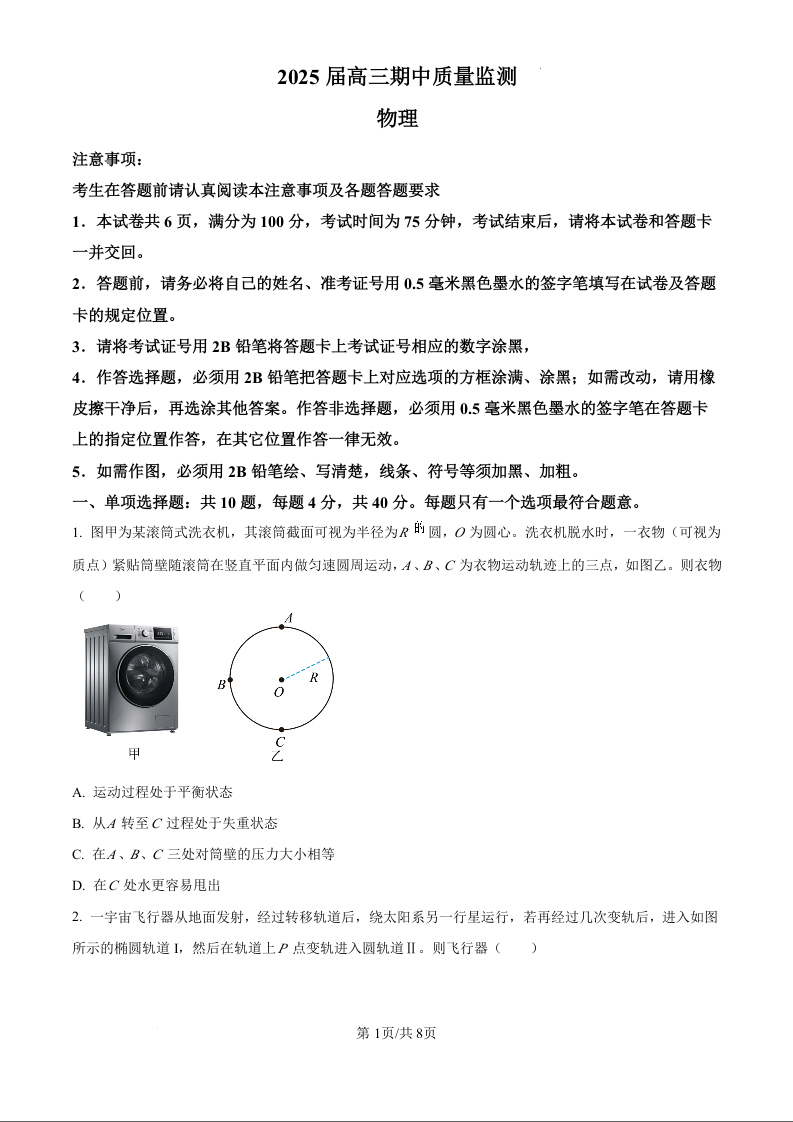 江苏省南通市通州区、如东县2025届高三上学期11月期中联考物理(原卷版)