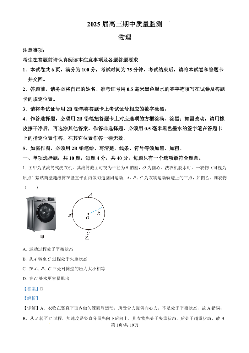 江苏省南通市通州区、如东县2025届高三上学期11月期中联考物理(精品解析版)