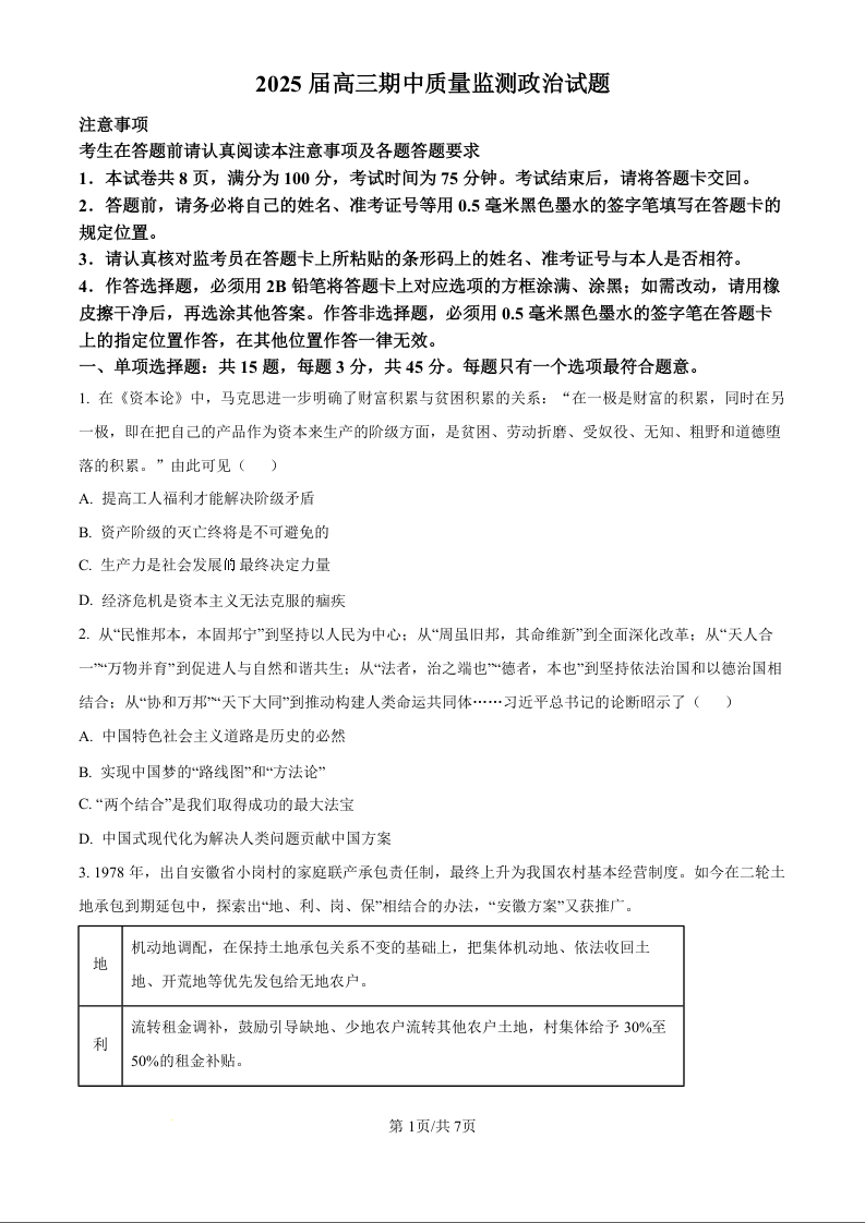 江苏省南通市通州区、如东县2025届高三上学期11月期中联考政治(原卷版)