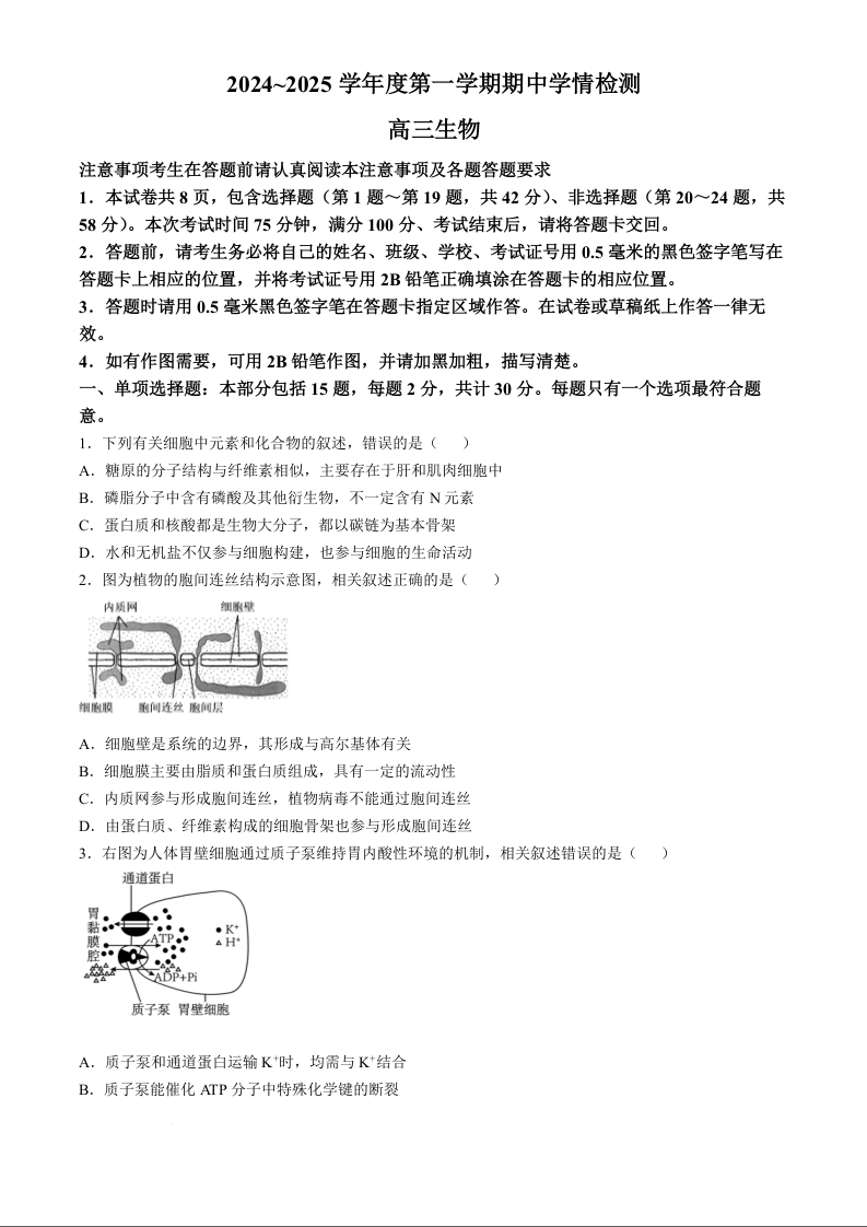 江苏省南通市通州区、如东县2025届高三上学期11月期中联考生物+答案