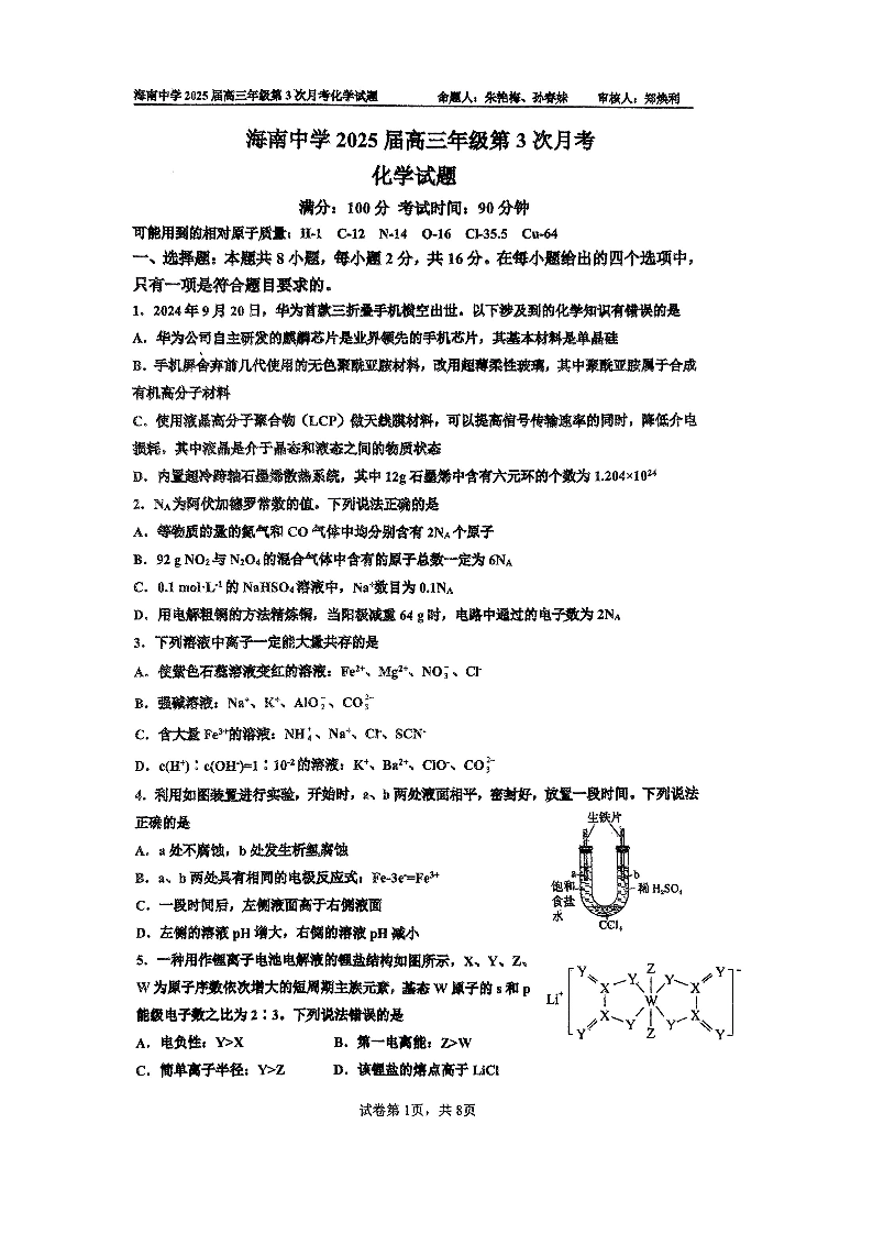 海南省海口市海南中学2025届高三上学期第三次月考化学
