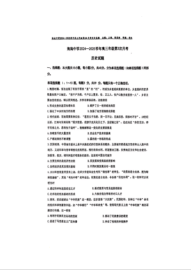 海南省海口市海南中学2025届高三上学期第三次月考历史+答案