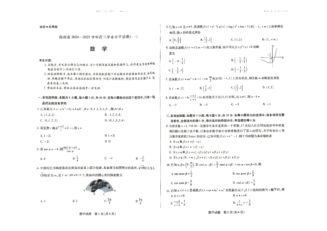 海南省2024-2025学年高三上学期学业水平诊断(一)数学