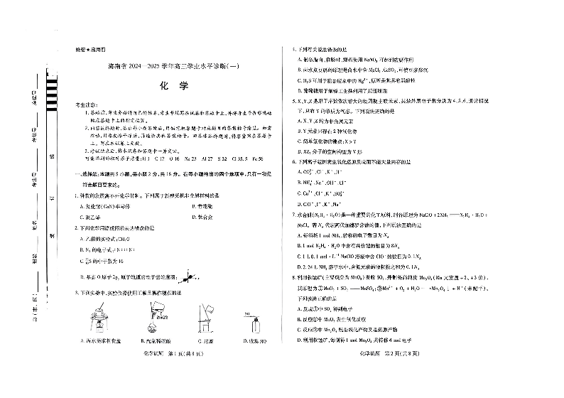 海南省2024-2025学年高三上学期学业水平诊断(一)化学