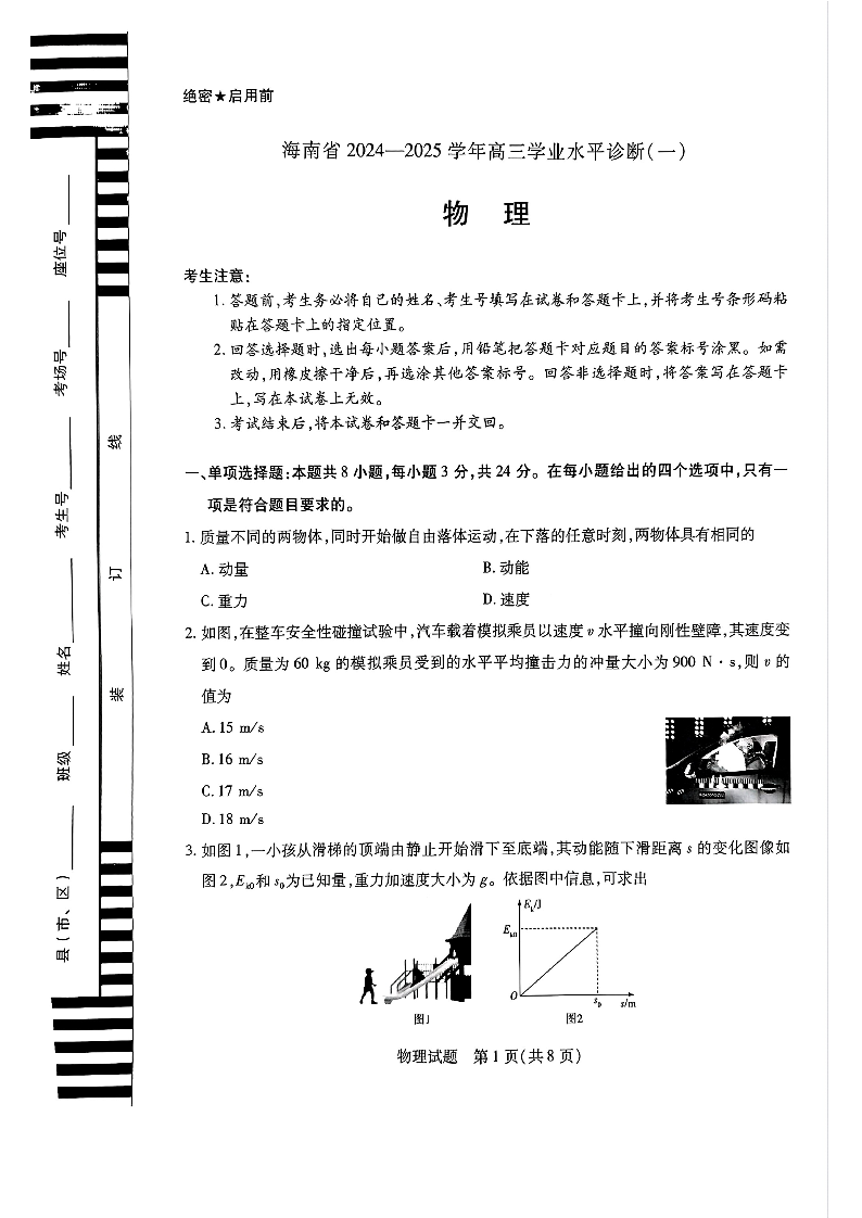 海南省2024-2025学年高三上学期学业水平诊断(一)物理+答案
