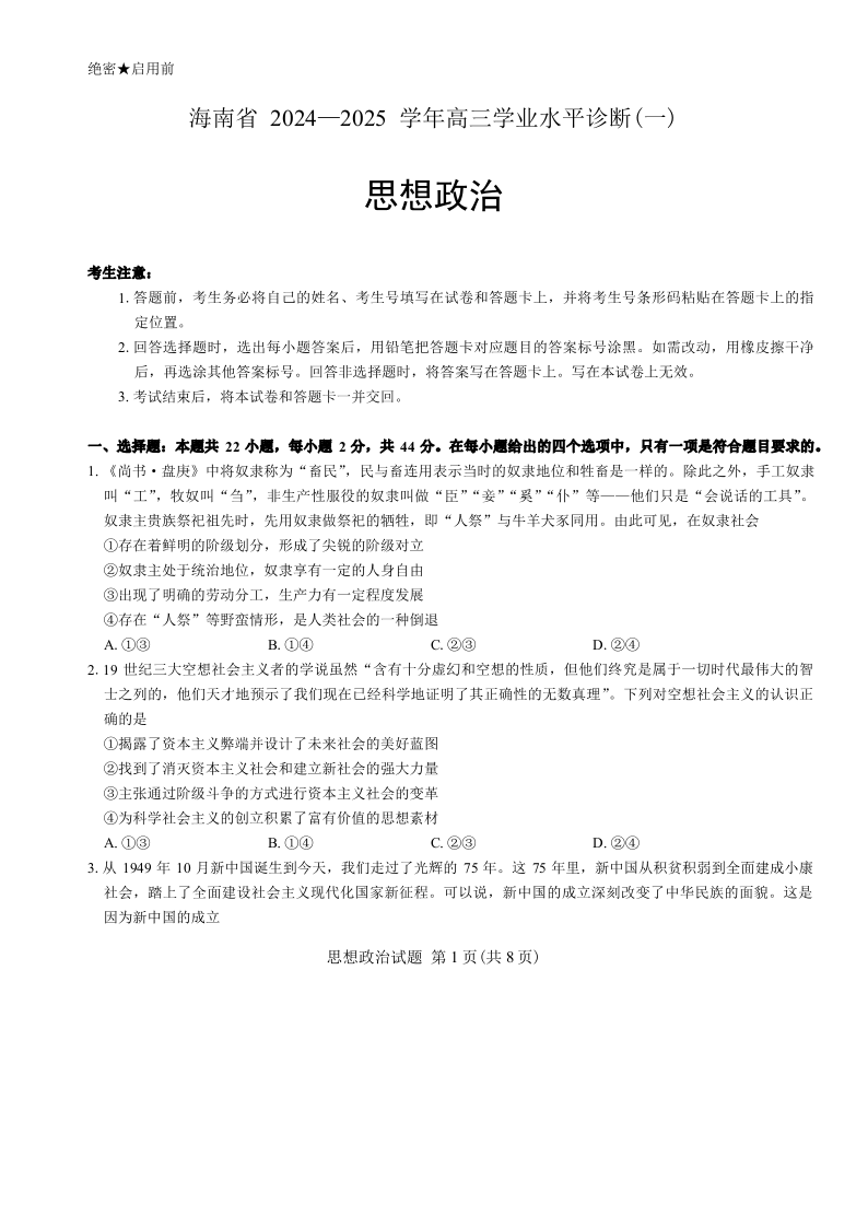 海南省2024-2025学年高三上学期学业水平诊断(一)政治+答案