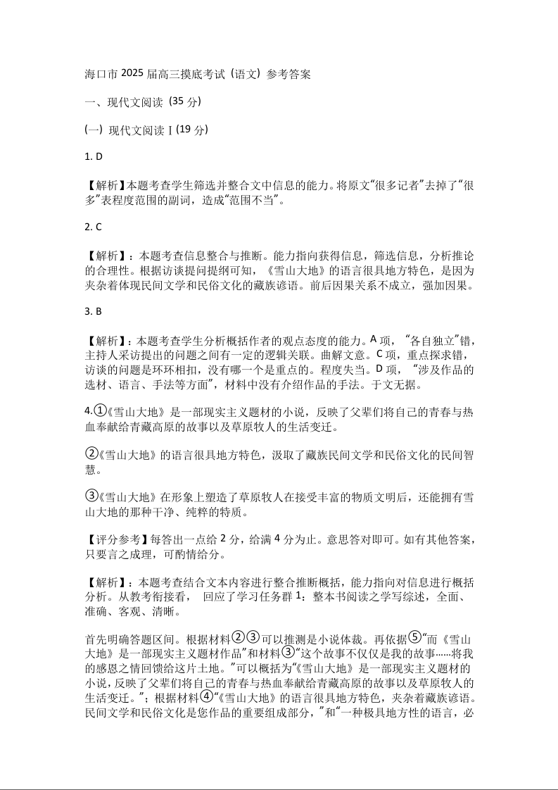 海南省海口市2025届高三上学期10月摸底考试语文答案