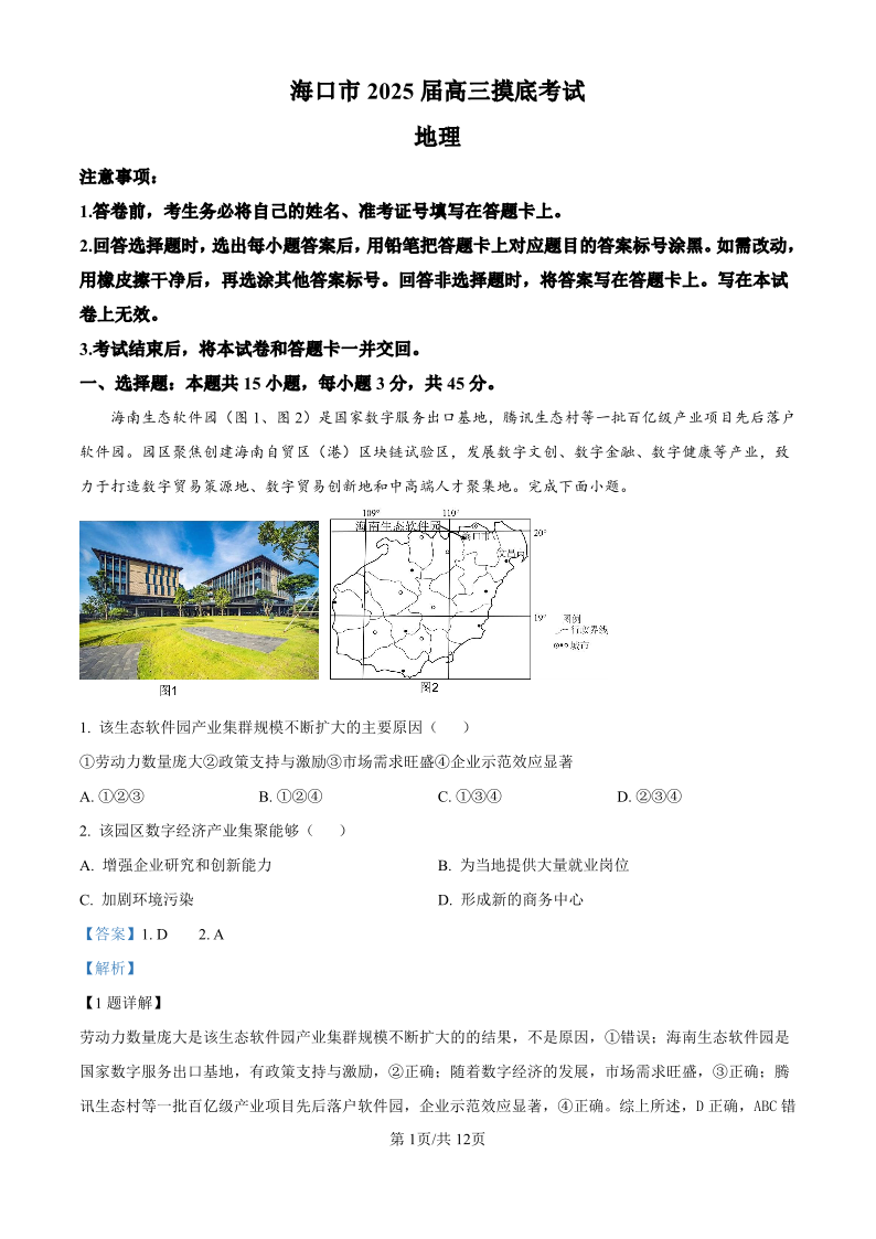 海南省海口市2025届高三上学期10月摸底考试地理(精品解析版)