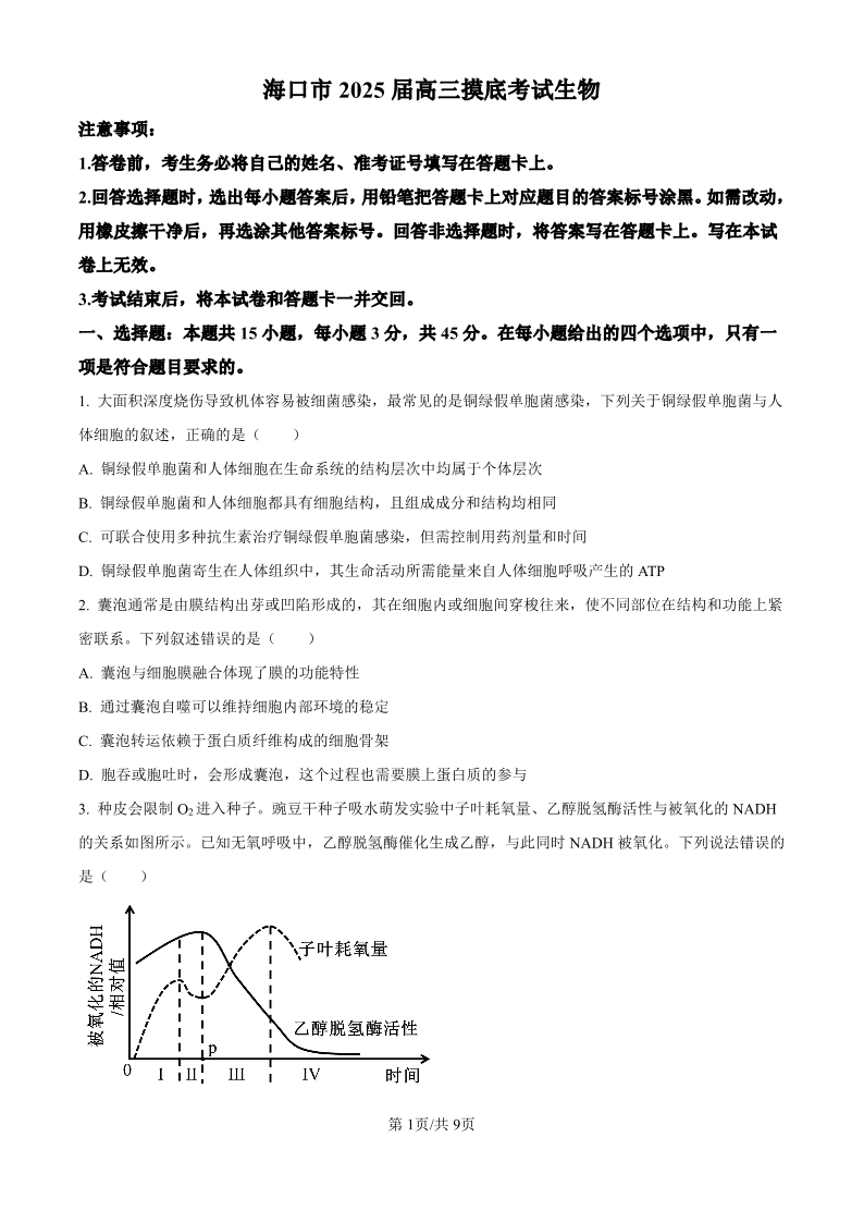 海南省海口市2025届高三上学期10月摸底考试生物(原卷版)