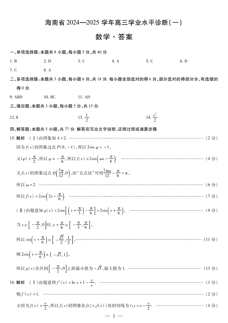 海南省20242025学年高三上学期学业水平诊断(一)数学答案