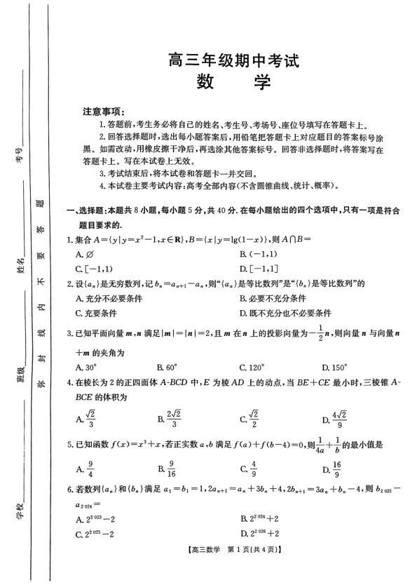 河北省部分学校2025届高三11月期中考试数学+答案