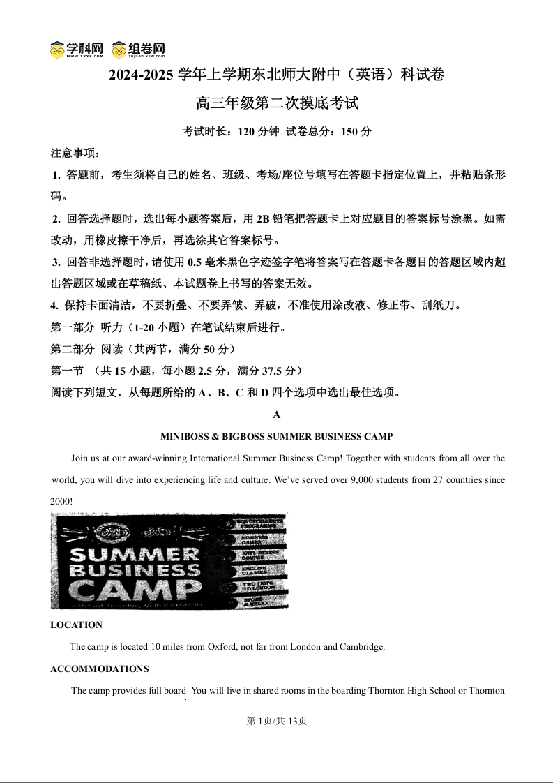 吉林省东北师范大学附属中学2025届高三上学期第二次摸底考试化学英语(原卷版)