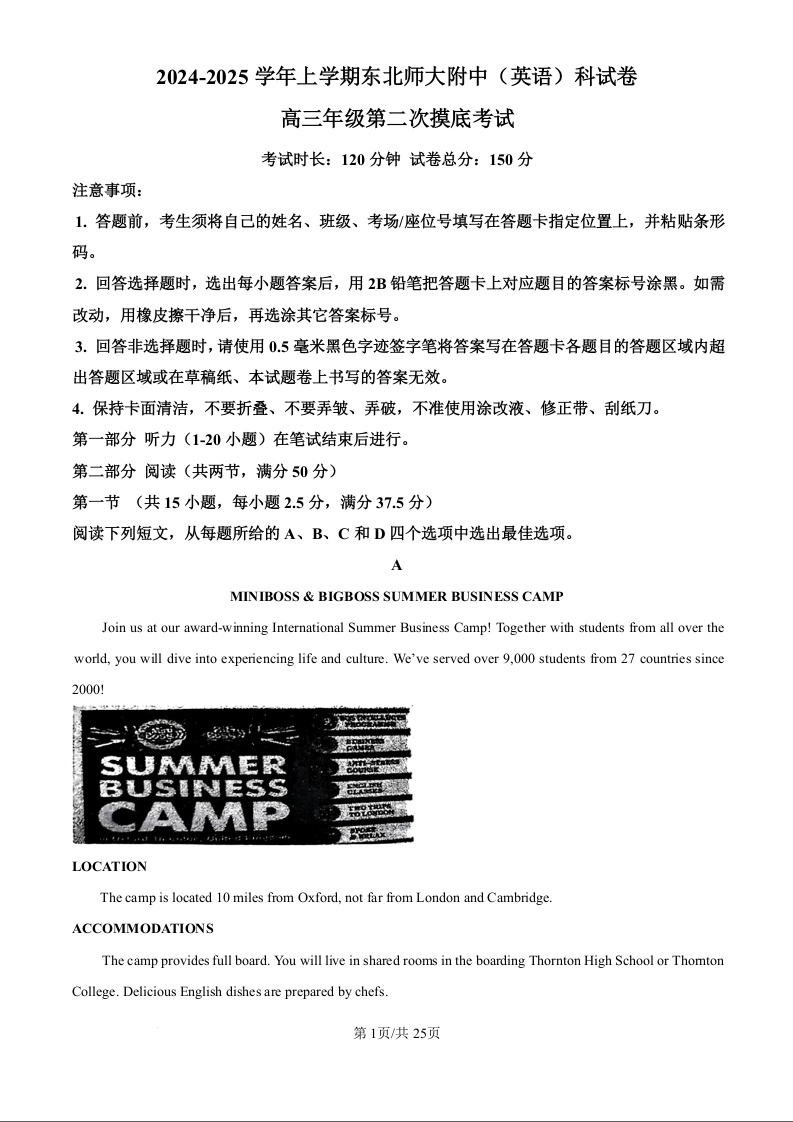 吉林省东北师范大学附属中学2025届高三上学期第二次摸底考试化学英语(精品解析版)