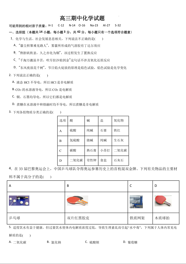 吉林省通化市梅河口市第五中学2025届高三上学期11月期中考试化学+答案