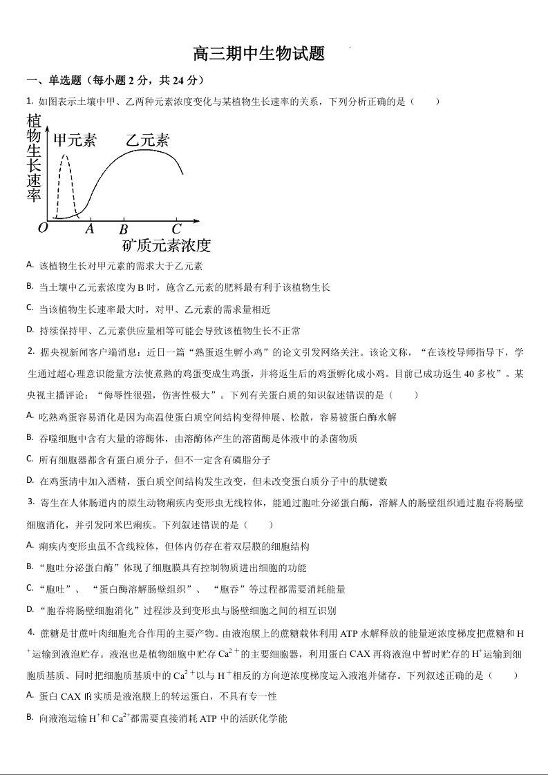 吉林省通化市梅河口市第五中学2025届高三上学期11月期中考试生物+答案