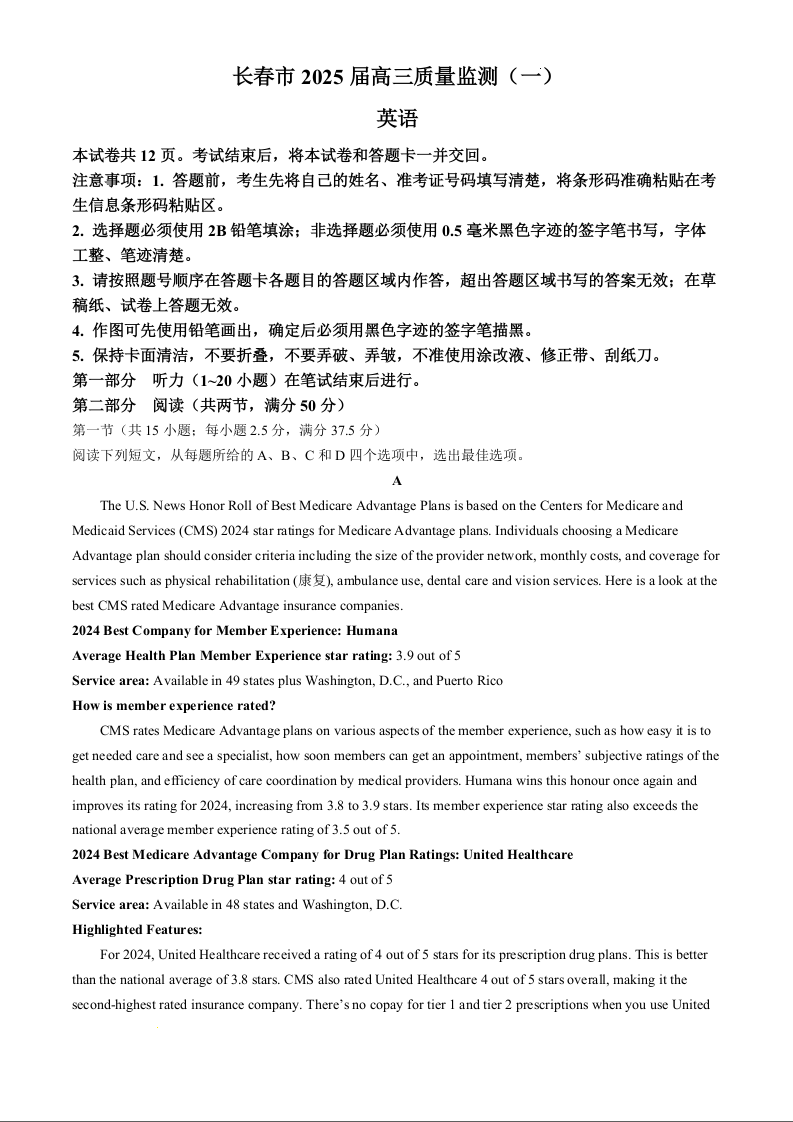 吉林省长春市2025届高三上学期质量监测(一)英语+答案