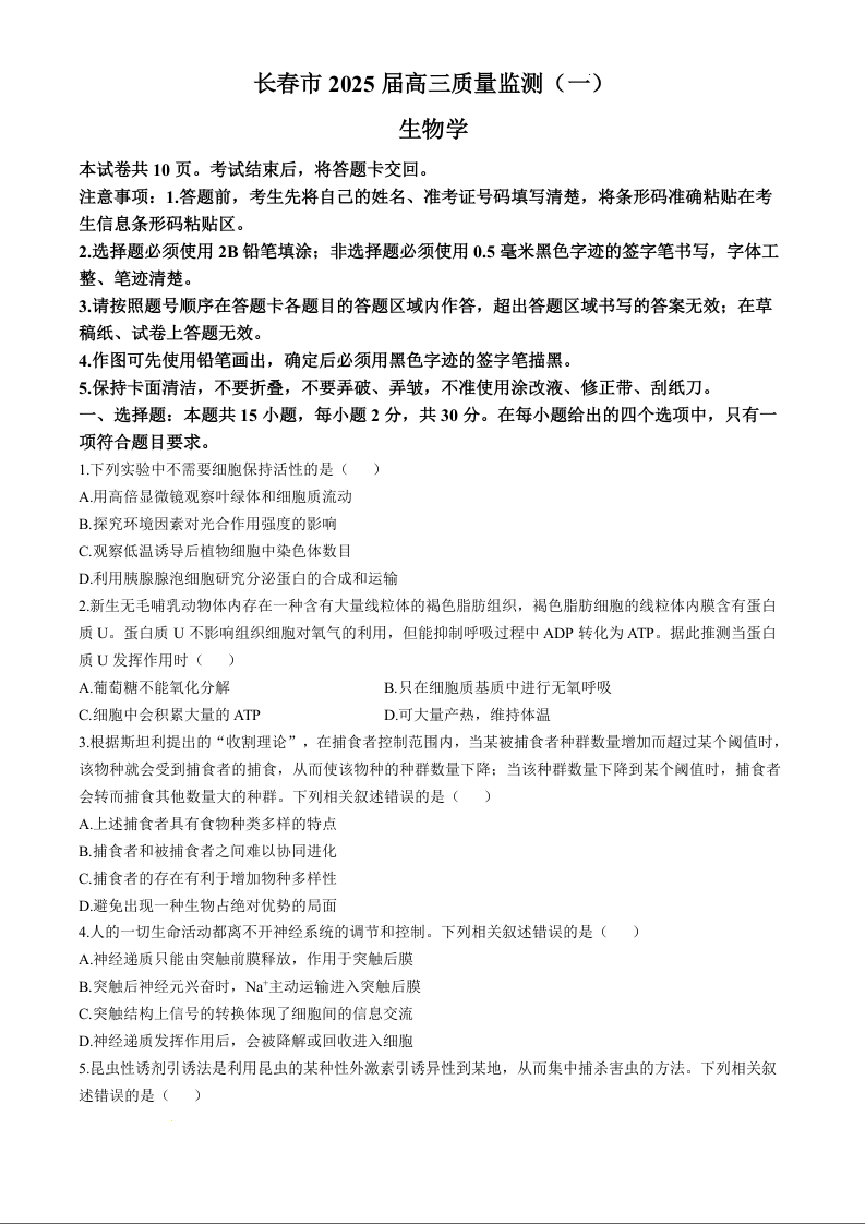 吉林省长春市2025届高三上学期质量监测(一)生物