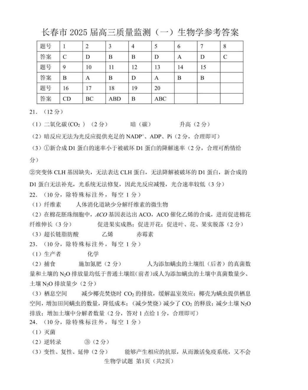 吉林省长春市2025届高三上学期质量监测(一)生物答案