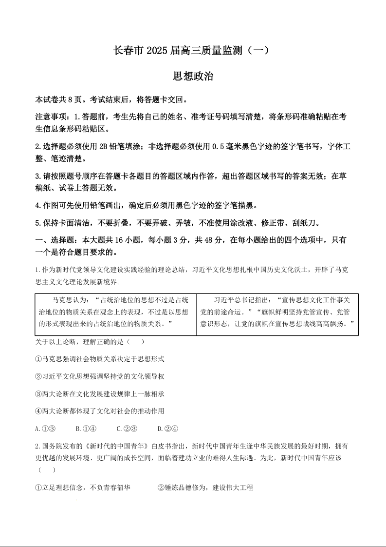 吉林省长春市2025届高三上学期质量监测(一)政治