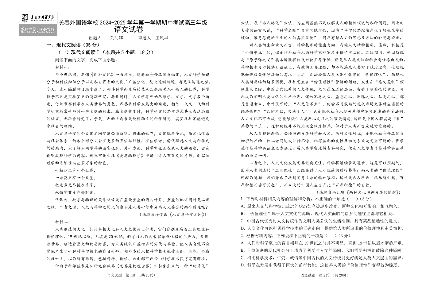 吉林省长春市外国语学校2025届高三上学期期中考试语文+答案
