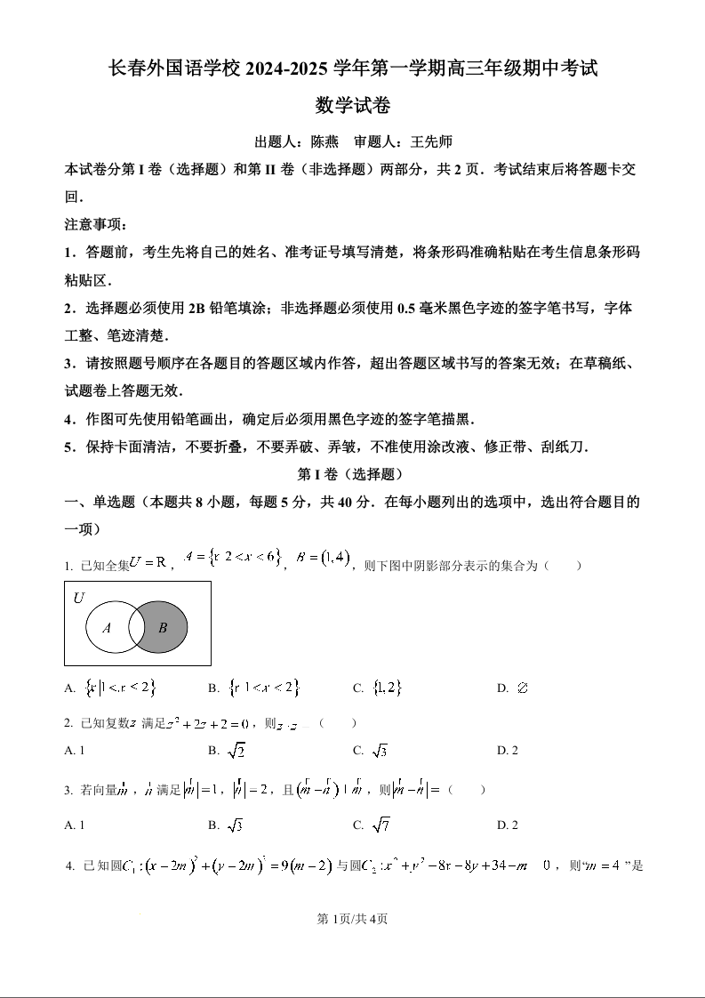 吉林省长春市外国语学校2025届高三上学期期中考试数学(原卷版)